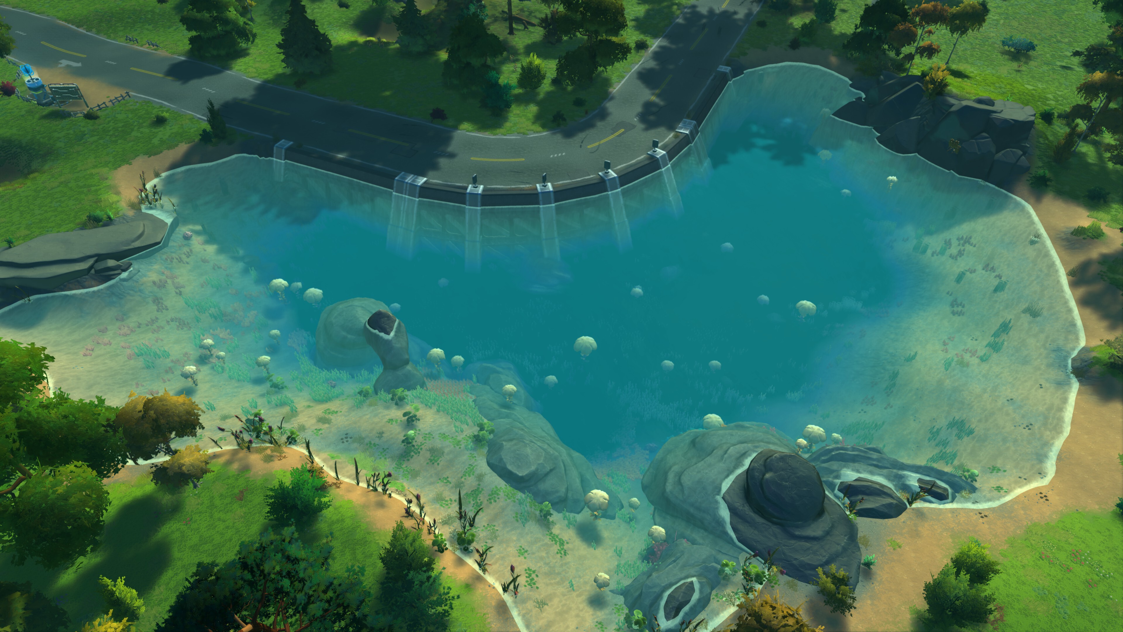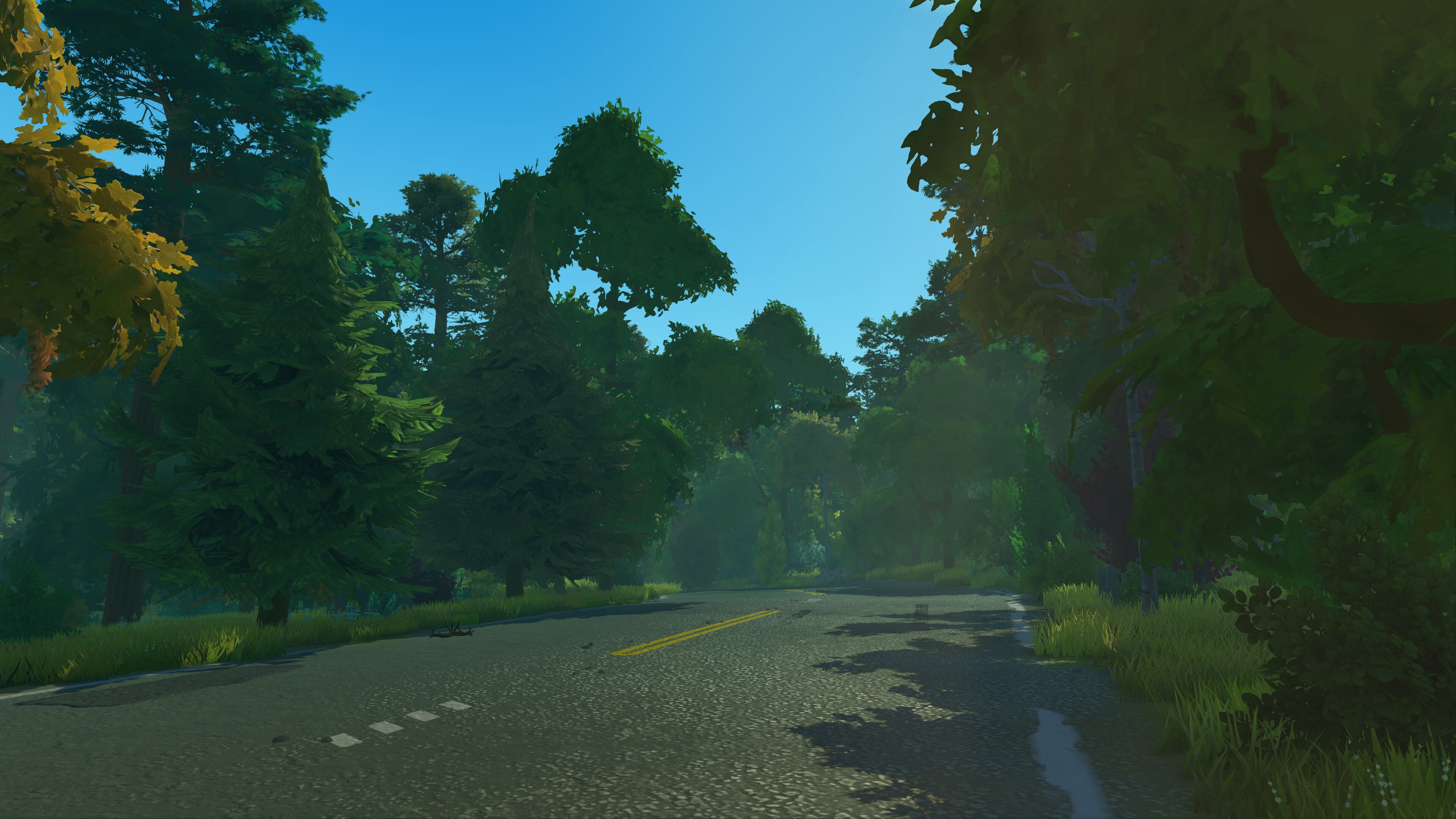 The survival terrain has received a really big overhaul, and we finally got around to adding all the things that we always wanted for the generated survival world. The aim was to create more varied and visually interesting places: beautiful forest roads as well as bridges, new mountain formations, and better desert biomes. We also added new ruins, secrets, as well as making sure road systems are better and easier to navigate with improved linking. Here are some new shots from the new survival terrain.